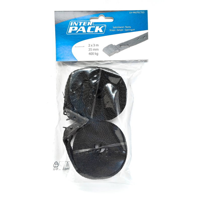 Duurzame textielriemen met metalen gespen , elk 300 cm lang. Ze kunnen worden gebruikt voor het vastzetten van bagage op een dakkoffer, het vastzetten van fietswielen op fietsendragers en voor vele andere doeleinden in huis en werkplaats. Een metalen slot (gesp) zorgt ervoor dat de riem altijd strak blijft zitten.