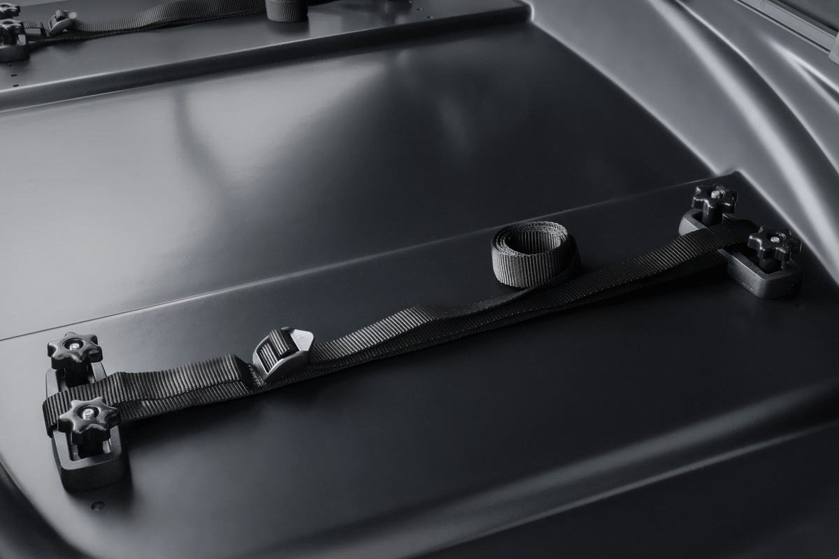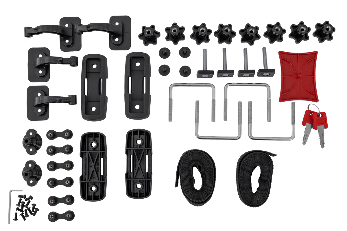 De set bevat textielriemen waarmee u uw bagage eenvoudig kunt vastzetten. De riemen worden aan het bevestigingssysteem bevestigd en zorgen voor een hoge stabiliteit van de bagage tijdens het rijden.