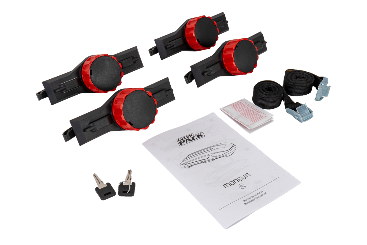 De set bevat ook textielriemen om de bagage tijdens het transport vast te zetten (de Monsun-box heeft speciale bevestigingspunten voor riemen).