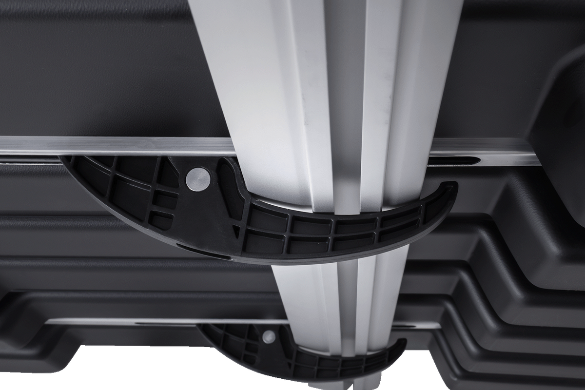 Het Rapid Fit -montagesysteem zorgt voor een snelle, veilige en eenvoudige installatie van de box op de dakdrager. Het past op alle soorten dakdragers : rechthoekig, ovaal en vleugelvormig.