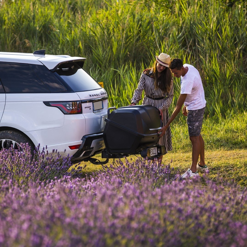 De Box GP met zijn moderne design en grote capaciteit maakt het mogelijk om uw fietsendrager om te toveren tot een praktische trekhaakdrager voor uw auto.