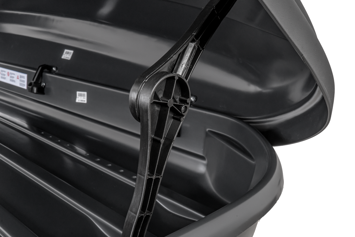 De dakkoffer is gemaakt van duurzaam kunststof bestand tegen UV-straling en de effecten van ongunstige weersomstandigheden. Ondanks de grote capaciteit weegt het geheel slechts 14 kg , met behoud van een maximale draagkracht van 75 kg . Gestroomlijnd deksel vermindert de luchtweerstand , wat zich vertaalt in meer rijcomfort en een lager brandstofverbruik.