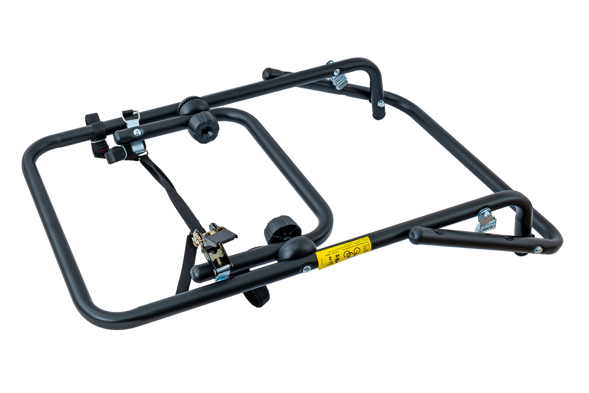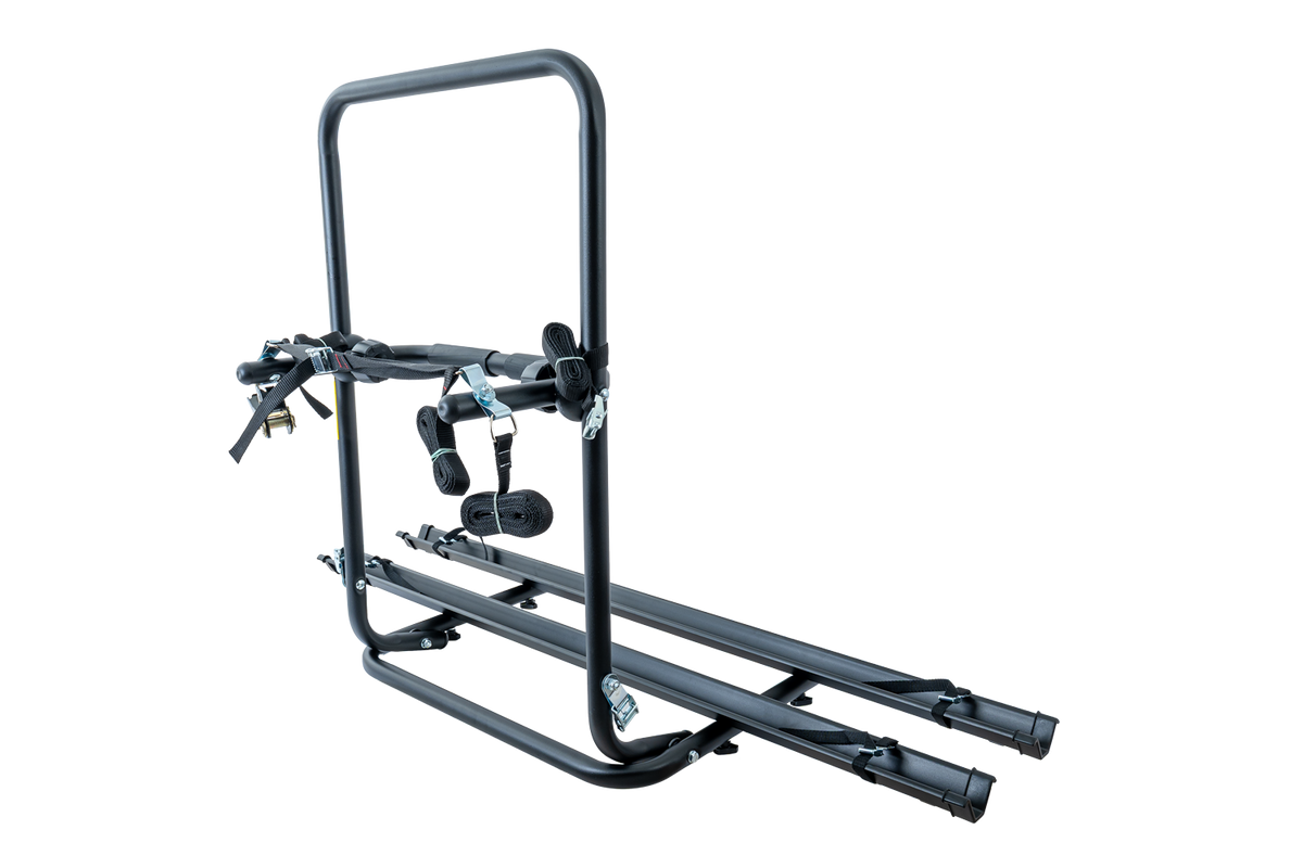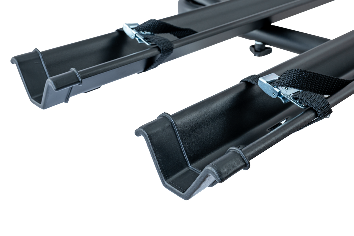 Elke fiets wordt individueel vastgezet met spanbanden en framebevestigingen, waardoor de fiets stevig vastzit en niet verschuift tijdens het fietsen. Bovendien zijn de wielgoten verstelbaar, waardoor de drager geschikt is voor verschillende wielbases. De fietsendrager is ideaal voor alle omstandigheden en is comfortabel in gebruik. Ingeklapt neemt de drager weinig ruimte in beslag, waardoor hij gemakkelijk op te bergen is.