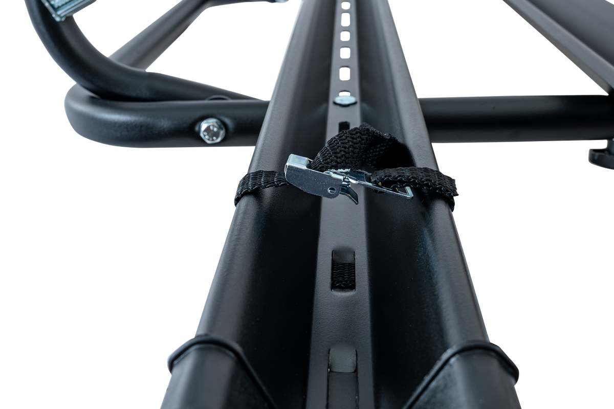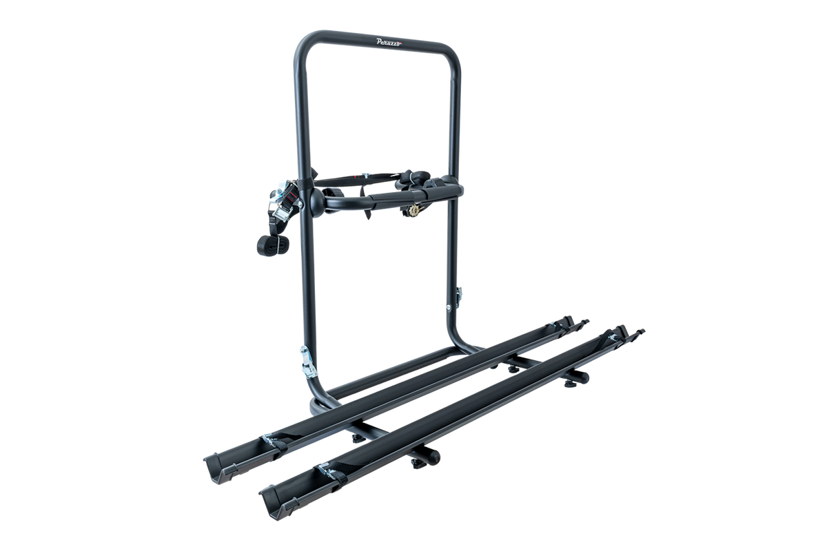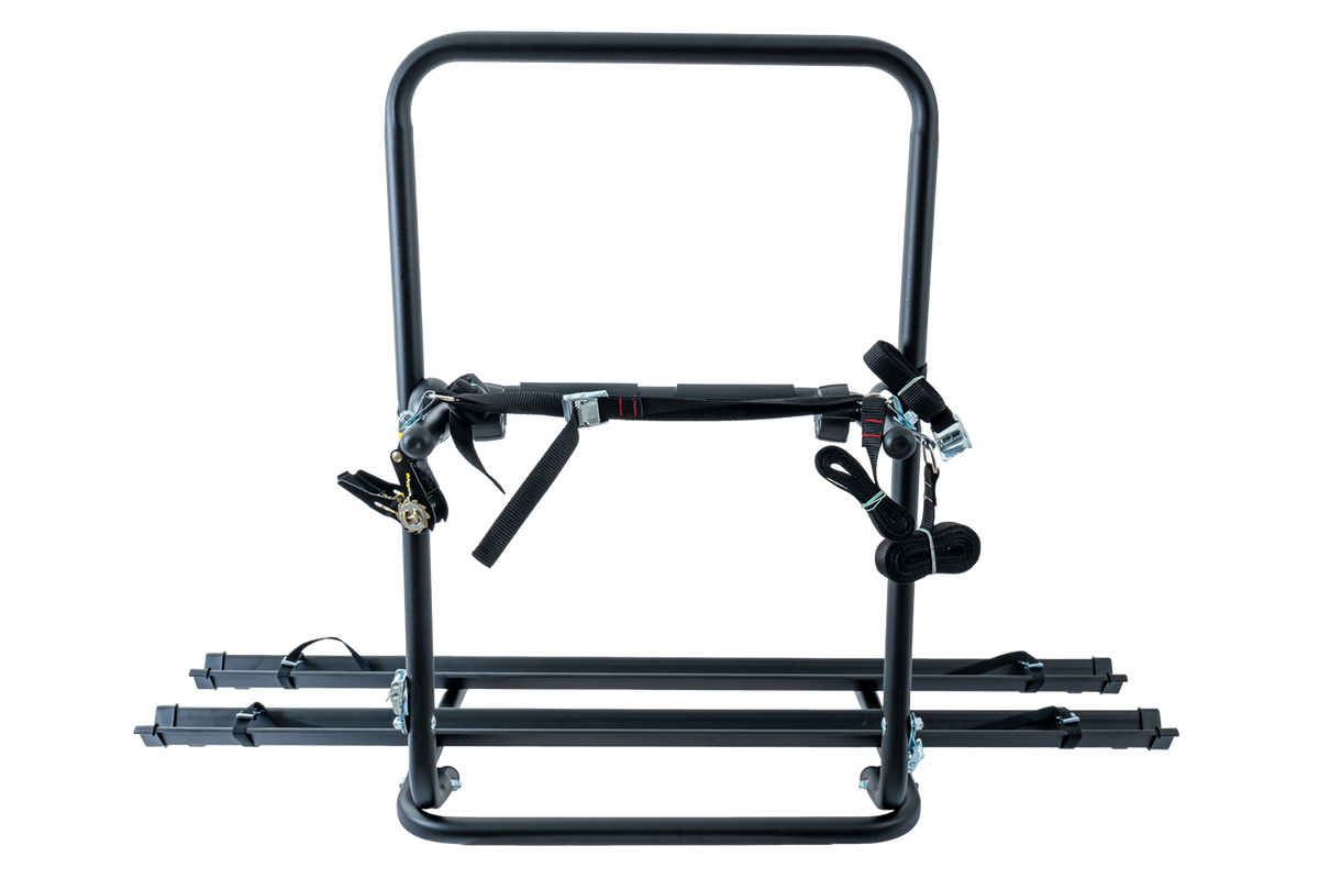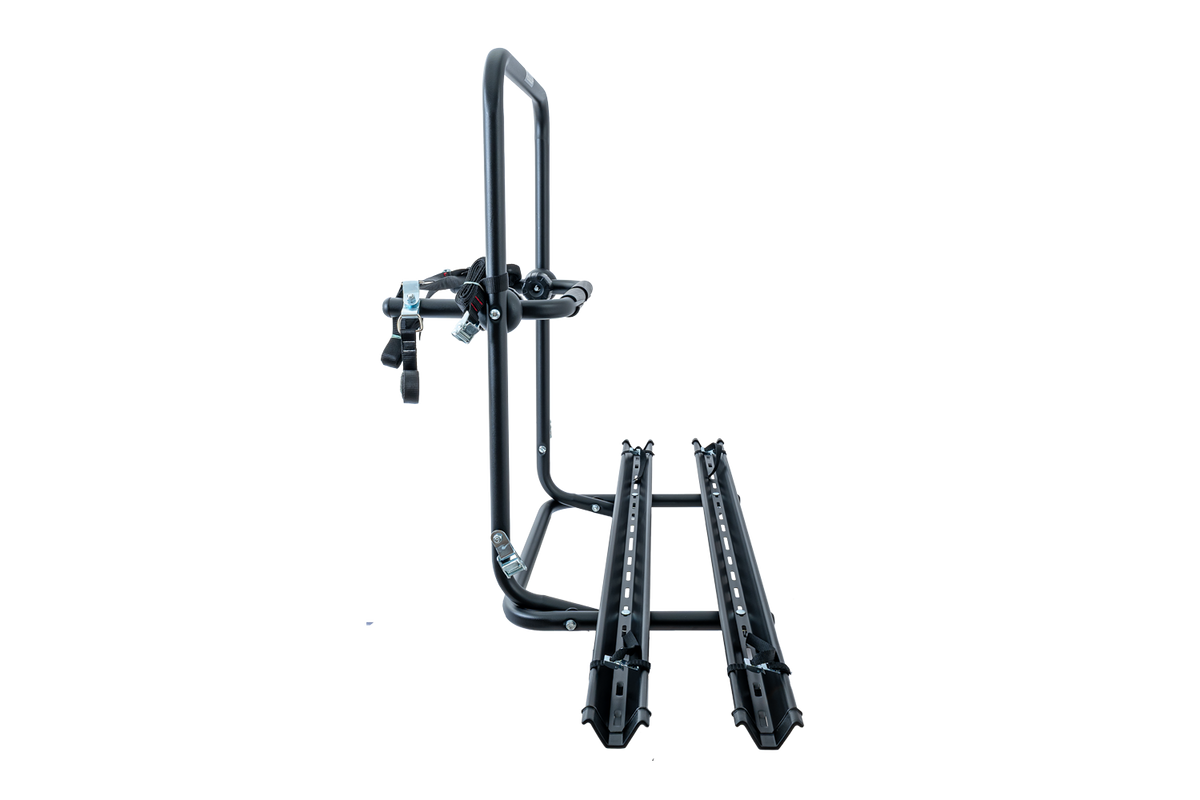 Elke fiets wordt individueel vastgezet met spanbanden en framebevestigingen, waardoor de fiets stevig vastzit en niet verschuift tijdens het fietsen. Bovendien zijn de wielgoten verstelbaar, waardoor de drager geschikt is voor verschillende wielbases. De fietsendrager is ideaal voor alle omstandigheden en is comfortabel in gebruik. Ingeklapt neemt de drager weinig ruimte in beslag, waardoor hij gemakkelijk op te bergen is.