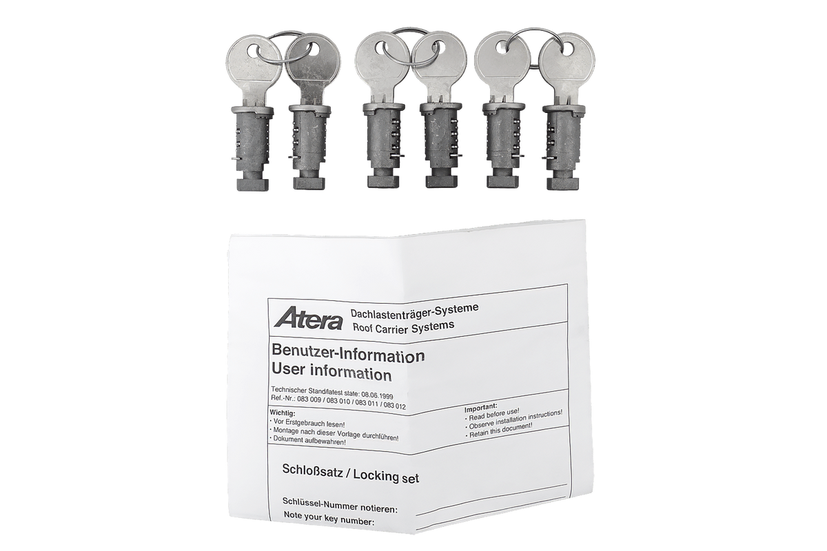 - De Atera slotenset, met 6 sloten en 2 sleutels, beveiligt rekken en accessoires effectief. Het garandeert duurzaamheid, betrouwbare werking en verhoogt de veiligheid.