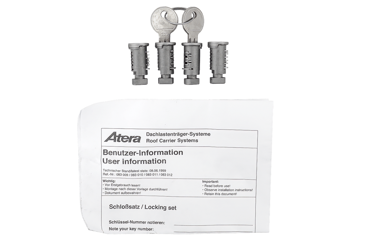 - De Atera slotenset, bestaande uit 4 sloten en 2 sleutels, beveiligt rekken en accessoires effectief. Het garandeert duurzaamheid, betrouwbare werking en verhoogde veiligheid.