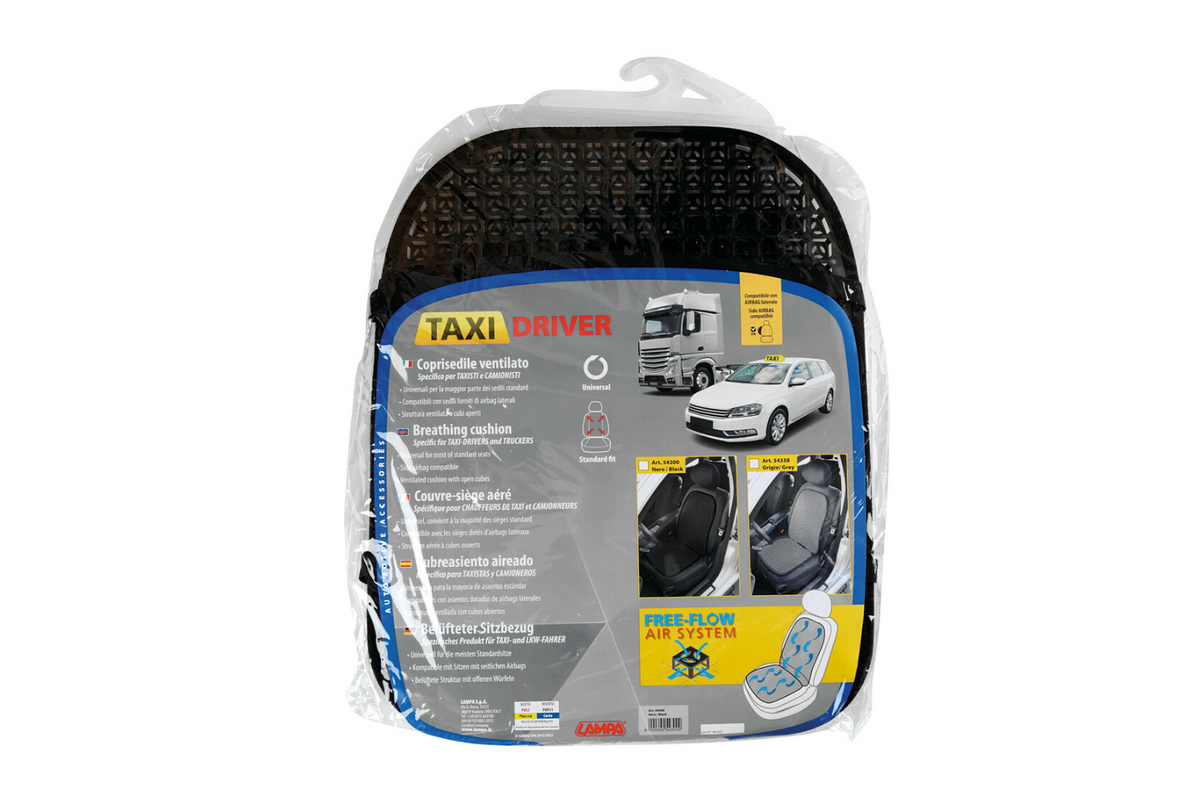 De Taxi Driver-stoelmat van LAMPA is een universele, geventileerde stoelmat, speciaal ontworpen voor mensen die lange uren achter het stuur doorbrengen . Dankzij de open, kubusvormige structuur en het Free-Flow Air System zorgt de mat voor een vrije luchtcirculatie, waardoor de temperatuur in de stoel daalt en het rijcomfort verbetert, vooral op warme dagen.