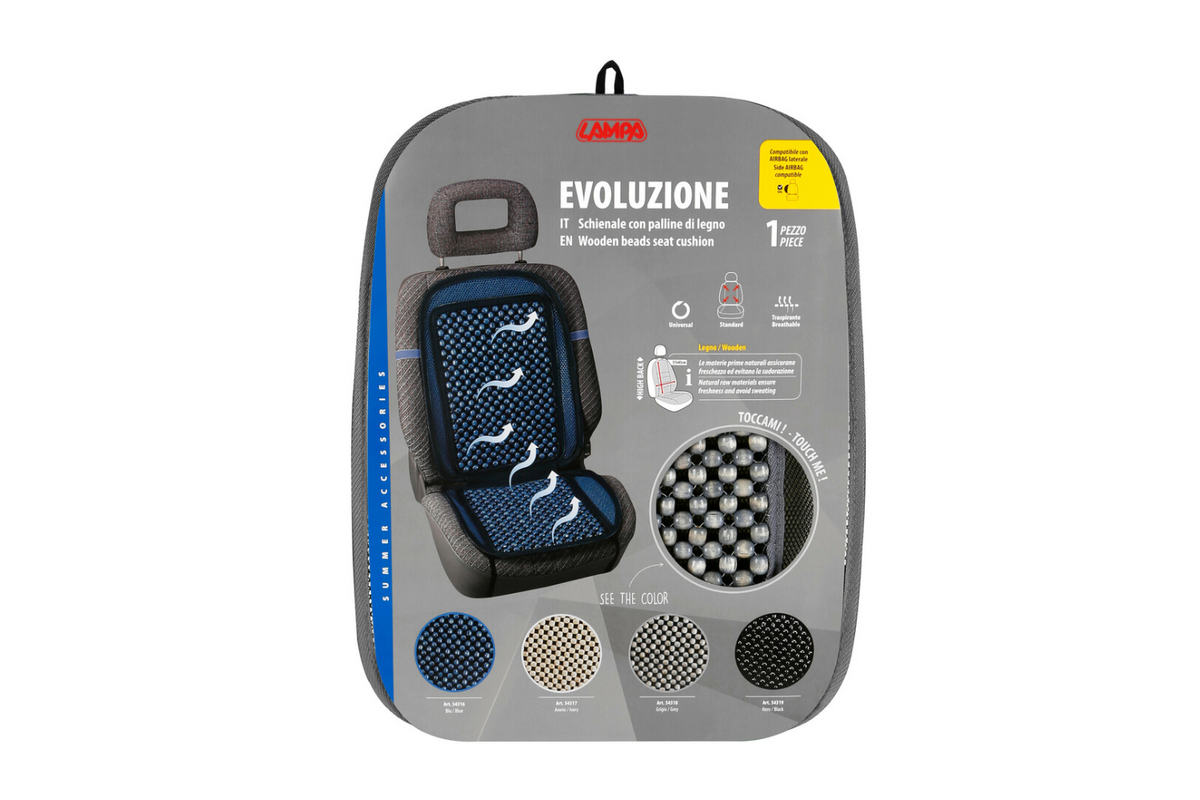 - Evoluzione is een universele zitmat van houten kralen die het rijcomfort verhoogt. De mat zorgt voor goede ventilatie, masseert de rug zachtjes en bevordert de bloedsomloop. Perfect voor lange ritten en compatibel met stoelen met zijairbags.