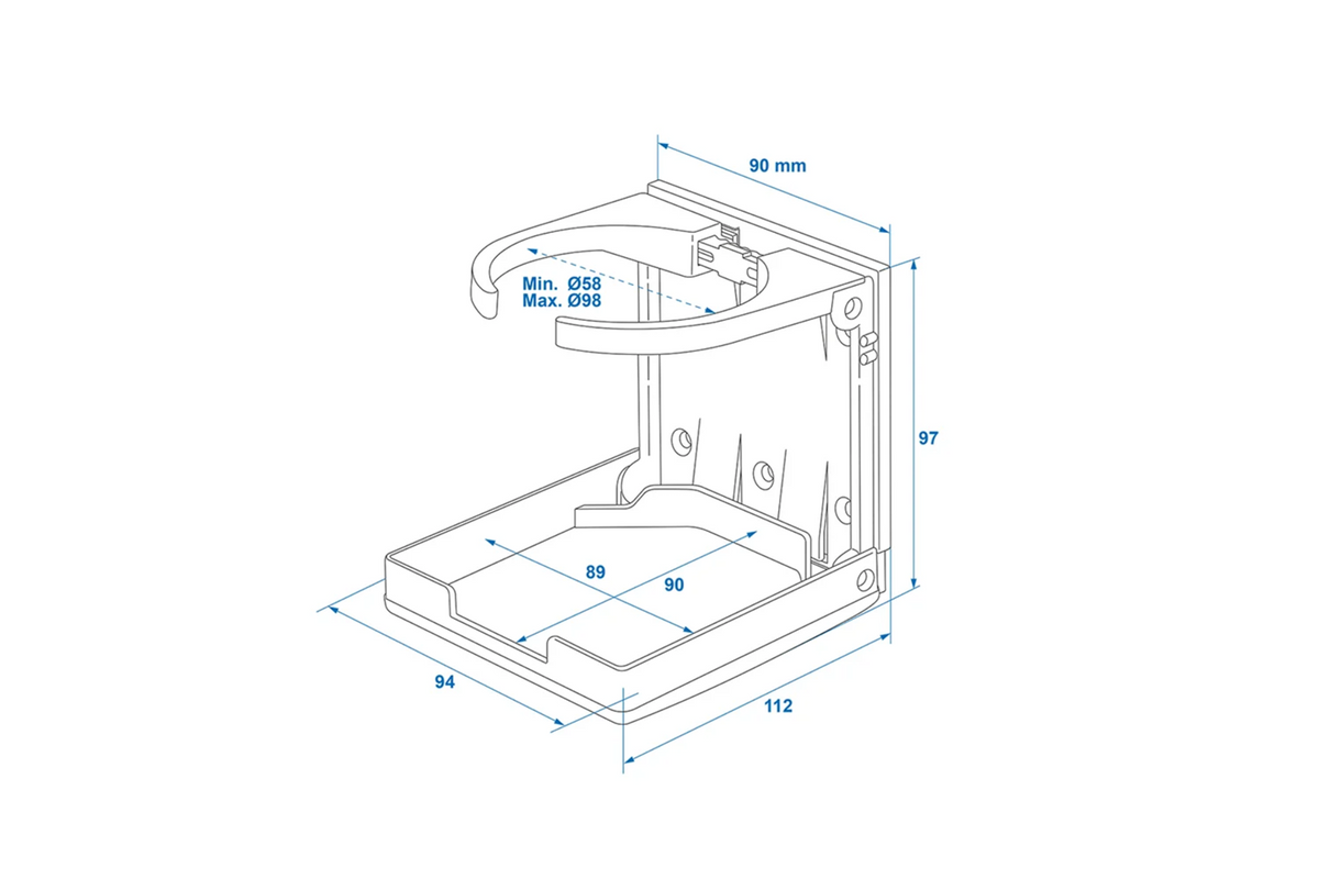 Met een verstelbare klem van 58–98 mm houdt de houder bekers, blikjes en flessen van verschillende formaten stevig vast. De constructie is gemaakt van een combinatie van duurzaam ABS-kunststof en staal, wat zorgt voor een lange levensduur en weerstand tegen dagelijks gebruik tijdens het reizen.