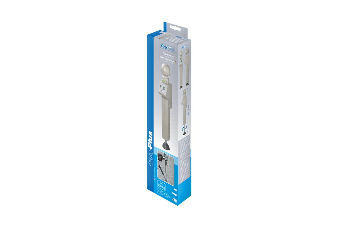- Een digitale weegschaal voor het meten van de disselbelasting van een aanhanger tot 150 kg. Hiermee kunt u snel en nauwkeurig de verticale belasting controleren, wat bijdraagt aan de stabiliteit van uw aanhanger en de veiligheid tijdens het rijden met e